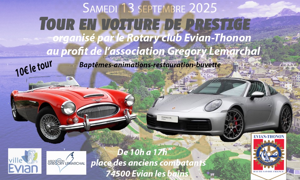 Samedi 13 septembre, de 10h à 17h, le Rotary Club Evian Thonon regroupera une grosse quarantaine de voitures de collection et de prestige à Evian, sur la place des Anciens Combattants.