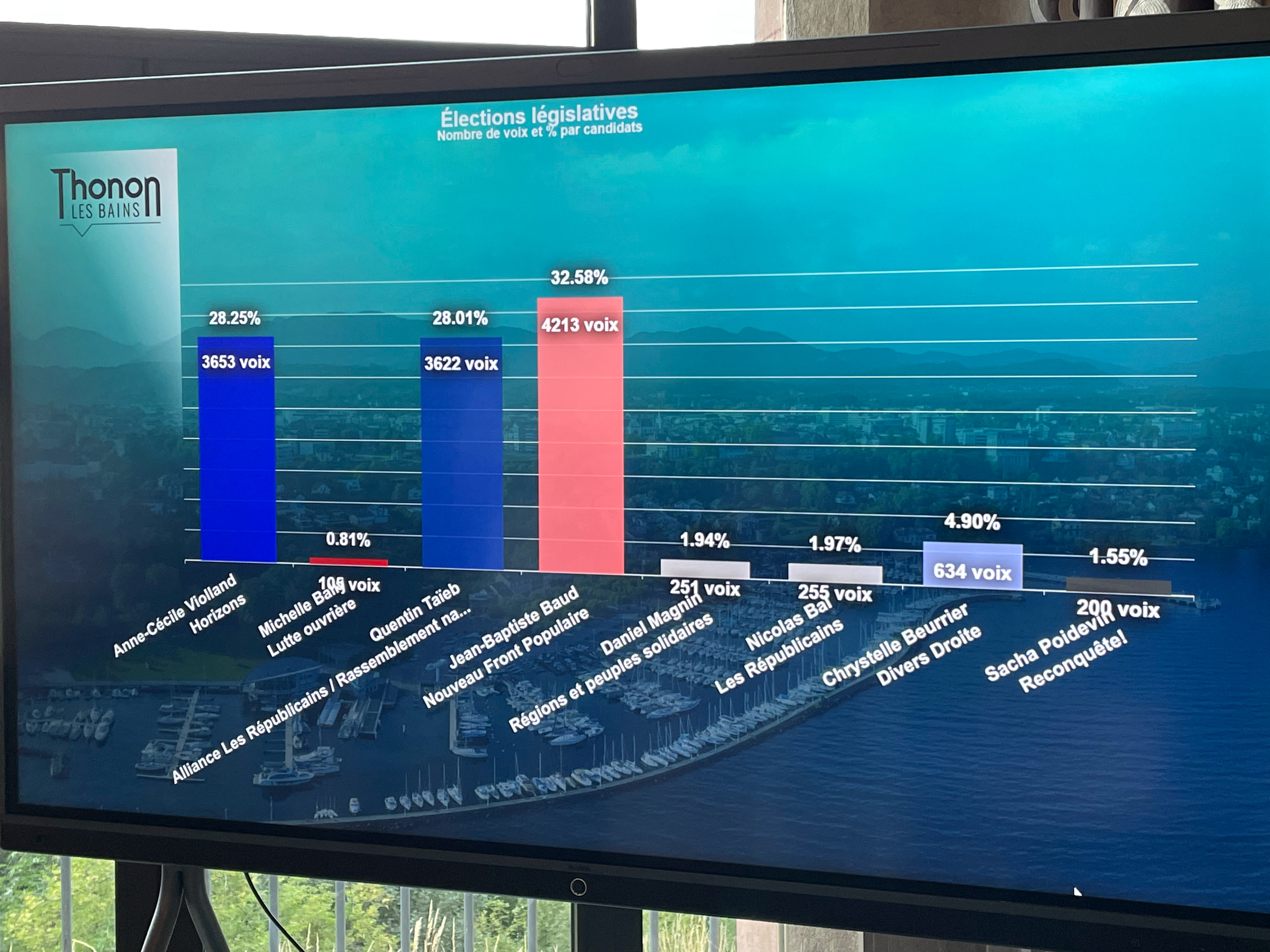 20h45 : Résultats partiels (42% de bulletins dépouillés) sur Annecy 1 : Véronique Riotton (Ensemble) en tête à 35,7% devant Guillaume Roit-Levêque (RN) à 34,4% et Anne-Valérie Duval (NFP) à 19,7%.